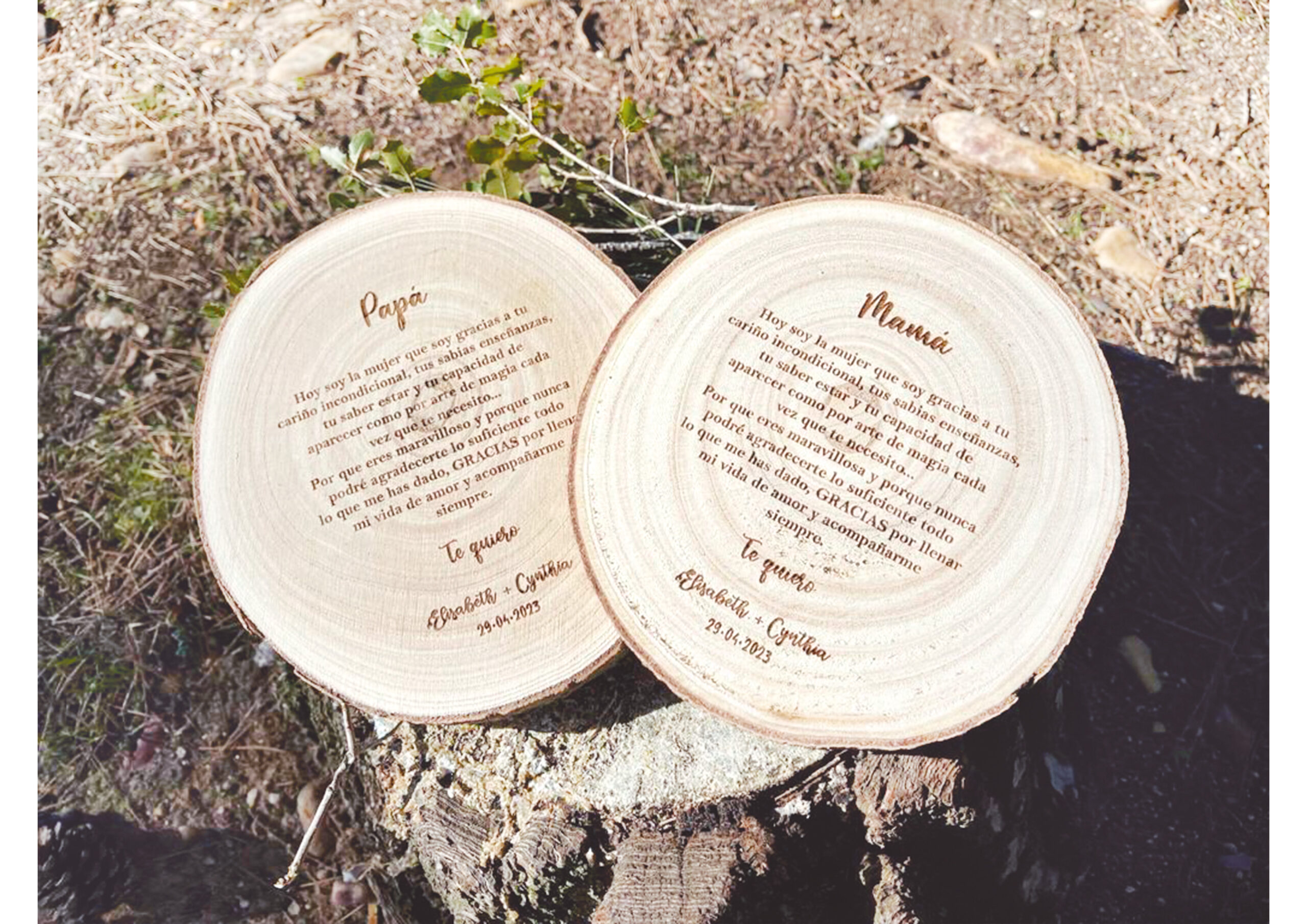 Preciosa rodaja de madera grabada en exclusiva para vosotros, un detalle natural y bonito a la vez que elegante para esa persona especial. Además, si nos lo pides añadiremos un agujerito para poder colgarlo en esa pared de casa que hará ese rincón especial.